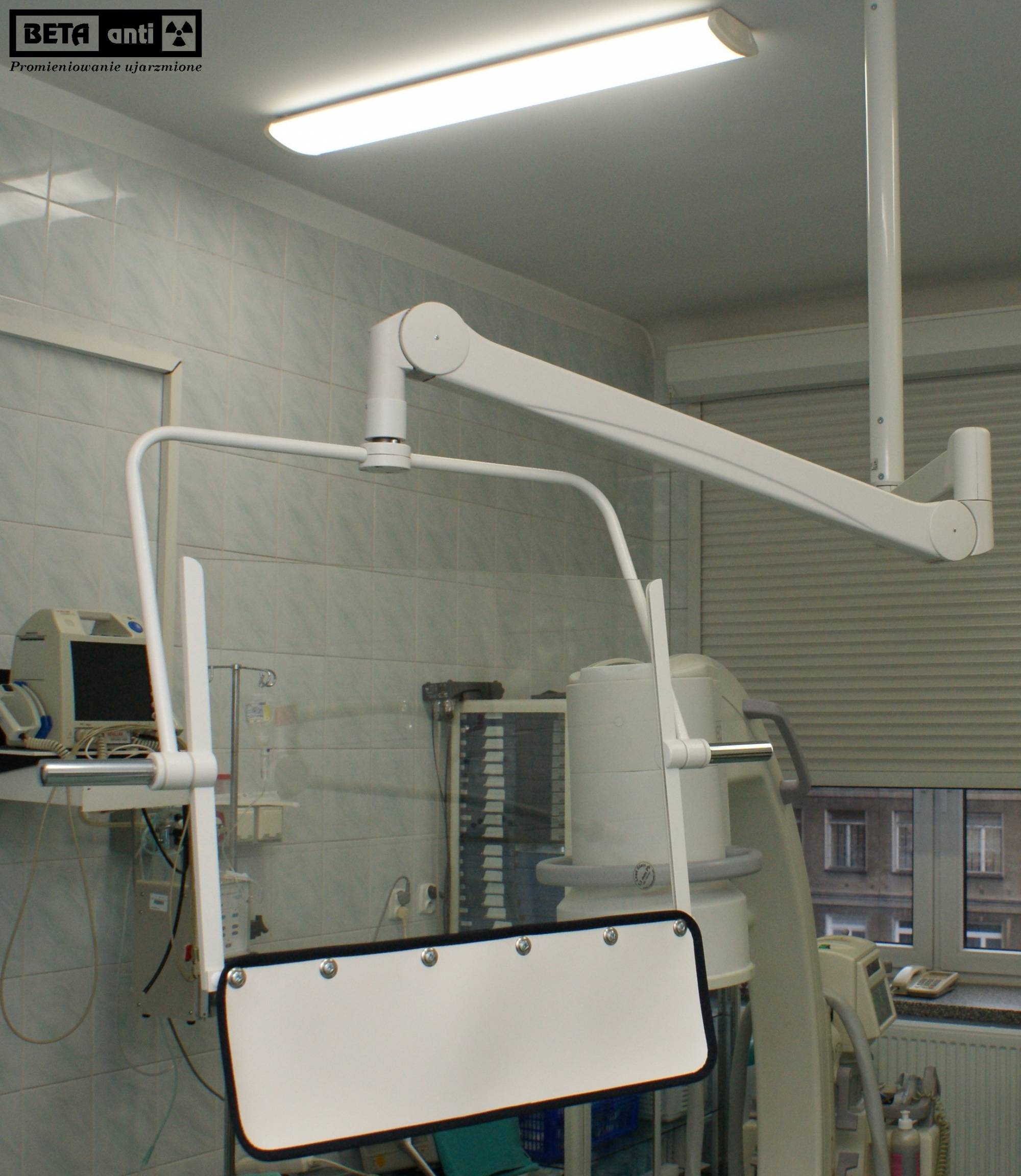 Ruchoma szyba zapewnia operatorowi wymaganą ochronę przed promieniowaniem rentgenowskim. Specjalny układ mechanizmów umożliwia natychmiastowe przechylenie szyby w dowolną pozycję jednocześnie pozwalając na obrót o 360 stopni w osi poziomej i pionowej.
