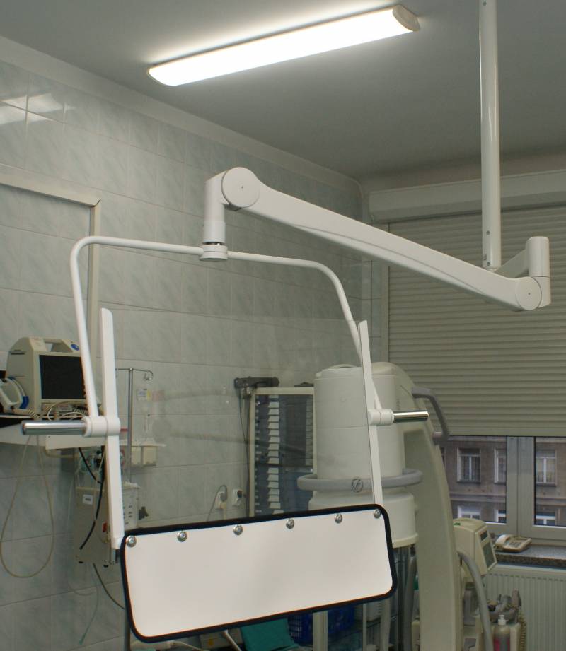Wygodny i łatwy w użyciu ruchomy system przymocowany do sufitu, w którym jest umocowana jest szyba ochronna umożliwia swobodę operowania całą konstrukcją.