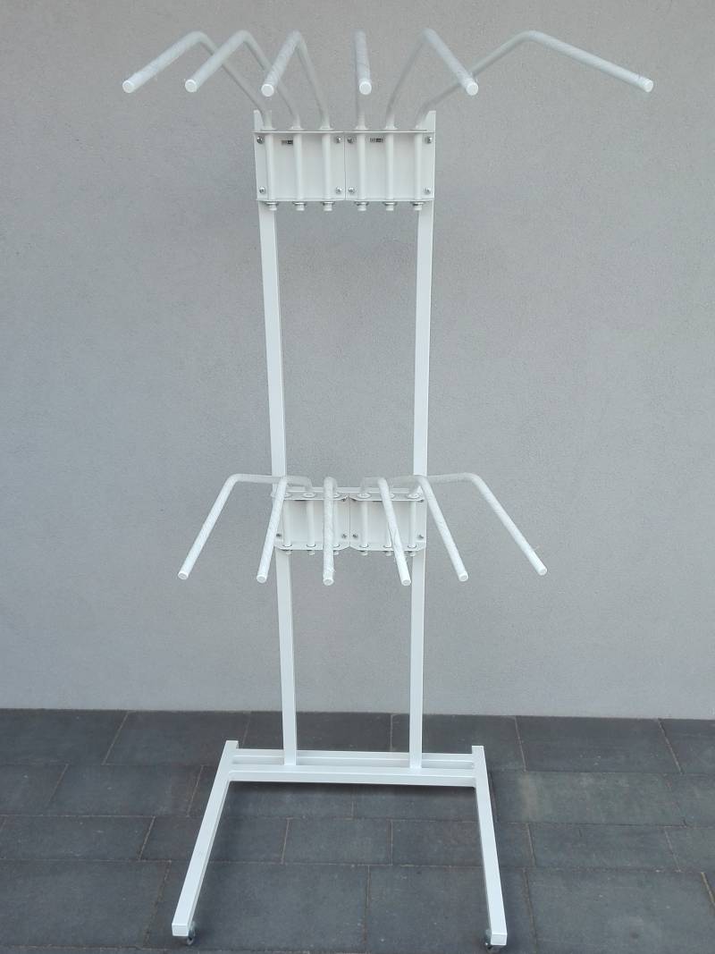 Wieszak z trzema, sześcioma lub dwunastoma (po 6 ramion w dwóch rzędach) obrotowymi ramionami umocowany na statywie jezdnym.
